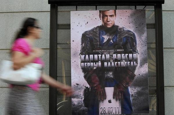 Dmitri Medvedev, representado en las calles de Moscú como el Capitán América